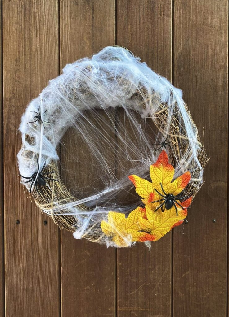 This DIY Halloween spider wreath combines rustic autumn vibes with spooky Halloween style. Using a grapevine base, dried florals, and