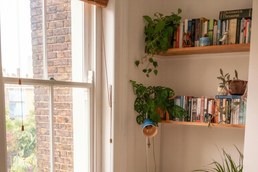 Floating shelves add storage without taking up floor space.