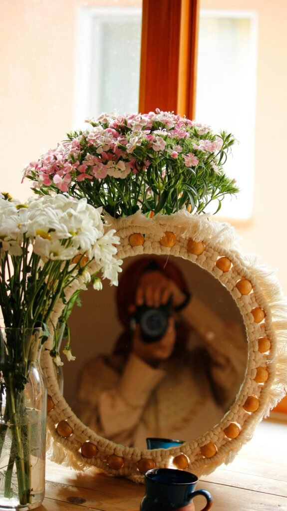 Decorate an old mirror frame with seashells, fabric, yarn, clay shapes, or mosaic tiles. It gives any room a handmade touch.