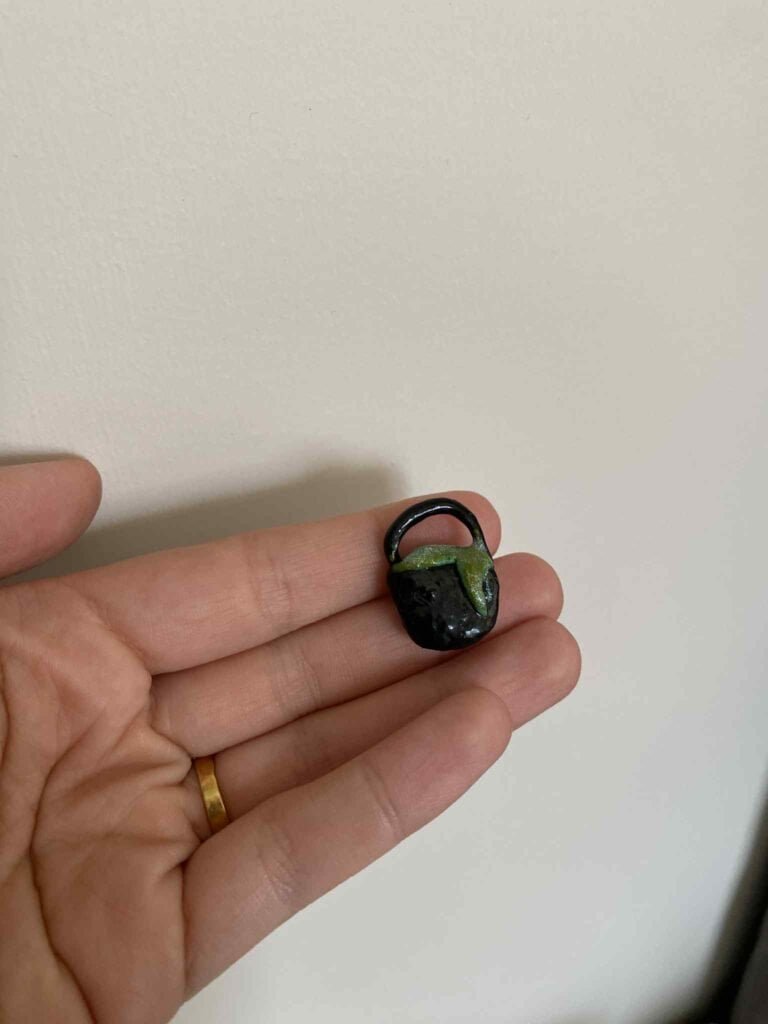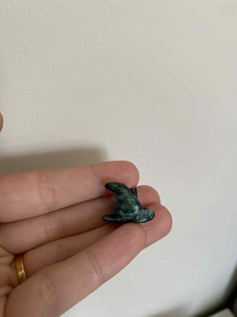 - Paint a glitter top coat on the green clay and a clear coat on the rest of the cauldron