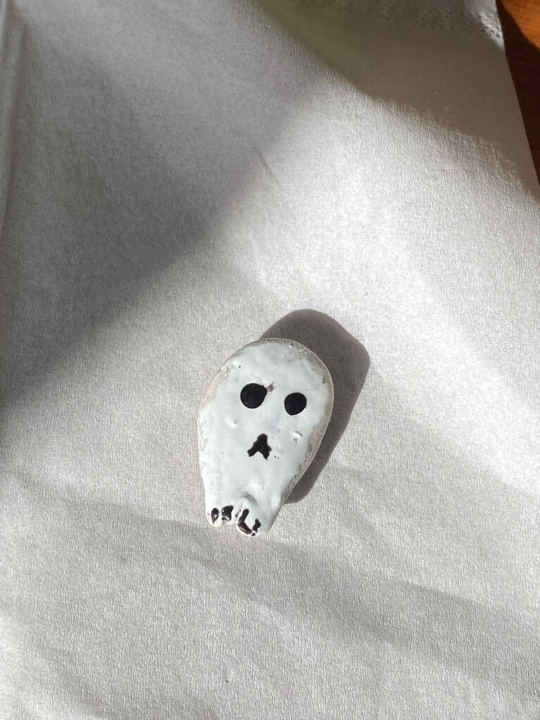 - Once baked, add with details carefully with black paint for the eyes and mouth. I use black gel paint.
